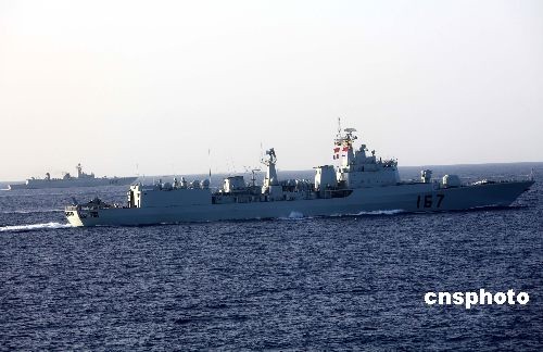 亚丁湾当地时间4月17日傍晚,中国海军第二批护航编队“深圳”号导弹驱逐舰左右桅杆分别悬挂出“祝贺你们取得优异成绩”、“祝你们一路顺风”的旗语,并鸣汽笛一长声,送别首批编队的“武汉”舰和“海口”舰。中新社发 孙自法 摄