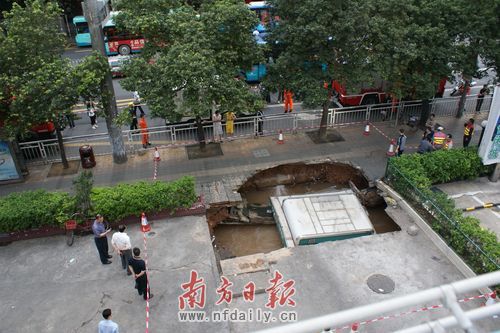 记者赶到现场看到,已经有罗湖消防中队的三辆消防车赶来抢险,南湖派出所和街道办以及罗湖水务公司管网所的工作人员也都到达现场,距离现场十几米的人行道也拉起了警戒线。塌陷的地面大坑长宽有4米左右、深2米,一根埋于地下深不到半米、直径约30厘米的水管裸露在外,水管爆裂处还在不停的往外冒水,一个写有中国邮政的报刊亭已经完全沉入了地下,大部分被水淹没。