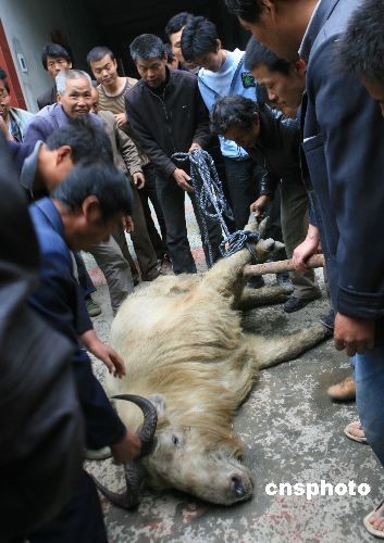 4月17日,从秦岭深跑到山外连伤5人的羚牛被动保人员麻醉后运走。当日,一头国家一级保护动物羚牛从陕西省西安市长安区滦镇秦岭深山冲下山,冲进附近村庄连伤5人致使7户家中物品受损。得到消息后,当地派出所的民警和乡镇、村干部赶到现场紧急疏散围观的村民。长安区林业局动保人员对羚牛实施麻醉抓捕送往陕西省野生动物抢救饲养中心。据动保人员介绍,这是一头雄性成年羚牛。眼下正是羚牛的求偶季节,这头羚牛可能是在秦岭山中争夺配偶时被打败,才跑下山来。 中新社发 刘珂 摄