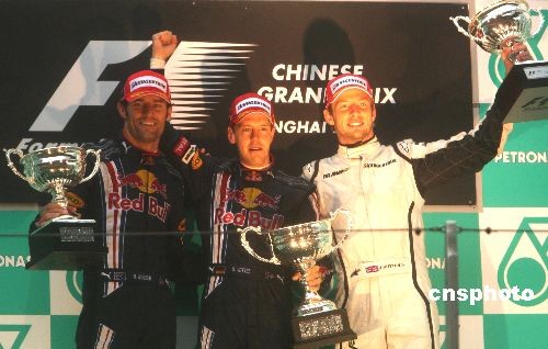4月19日,2009年F1中国大奖赛在上海国际赛车场结束。红牛车队维泰尔(中)和韦伯(左)在一场雨战中包揽冠亚军。布朗车队巴顿取得季军。中新社发 赵振清 摄