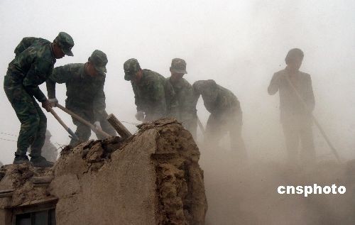 4月20日,解放军战士正在发生地震的阿合奇县库兰萨日克乡别迭里村地震灾区拆除危房。19日12时8分18.4秒,新疆阿合奇县发生5.5级地震,震中位置为北纬41.3°,东经78.3°。据国家地震台网测定的相关数据显示,此次地震震源深度约7公里,属浅源地。初步统计,该县受灾人口1.51万人,3220户,地震造成的直接经济损失达5400余万元人民币,其中农牧民居住房屋等基础设施损失4000余万元,公用、商用等基础设施损失1400余万元,目前尚无人员伤亡报告。中新社发 曾垂涛 摄