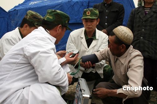 4月20日,解放军抗震救灾医疗救护队正为发生地震的新疆阿合奇县受灾群众检查身体。中新社发 曾垂涛 摄