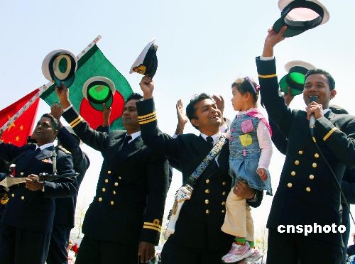 4月21日,在庆祝中国人民解放军海军成立60周年多国海军活动“欢乐的海洋”军乐队联合演出时,与孟加拉海军舰艇乐队同台演出的这名青岛小女孩受到在场多国海军官兵的喜爱。同时,韩国、俄罗斯、印度、美国、巴西来访舰艇乐队和中国海军军乐队、北海舰队军乐队参加了联欢演出。中新社发 宋吉河 摄