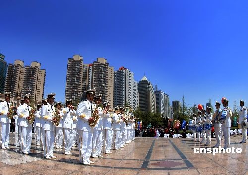 庆祝中国人民解放军海军成立60周年多国海军活动,4月21日在青岛“五四”广场举行“欢乐的海洋”军乐队联合演出,韩国、俄罗斯、印度、美国、孟加拉、巴西来访舰艇乐队和中国海军军乐队、北海舰队军乐队参加了联欢演出。中新社发 宋吉河 摄