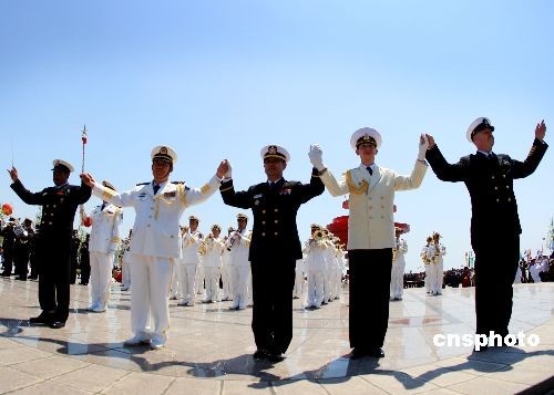 庆祝中国人民解放军海军成立60周年多国海军活动,4月21日在青岛“五四”广场举行“欢乐的海洋”军乐队联合演出,韩国、俄罗斯、印度、美国、孟加拉、巴西来访舰艇乐队和中国海军军乐队、北海舰队军乐队参加了联欢演出。中新社发 宋吉河 摄