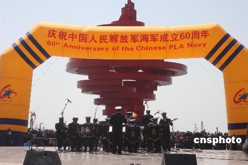 印度海军军乐队在青岛庆祝中国海军60周年活动中表演。中新社发 郭国权 摄