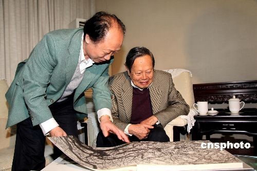 著名画家冯大中为杨振宁介绍自己的历年画作。中新社发 王保胜 摄
