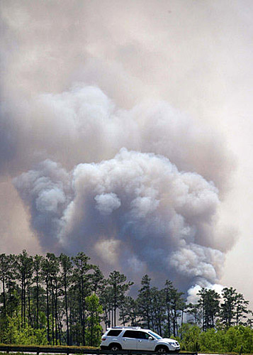 4月23日,山火引发的滚滚浓烟从美国南卡罗来纳州的北默特尔比奇升起。美国南卡罗来纳州近日发生山火,已经造成数十所房屋被毁,数百人离开家园。