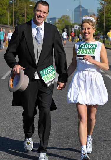 据英国媒体报道 英国一对名叫基特斯和皮特的恋人在二十六日的伦敦马拉松赛进行期间,“顺道”跑到教堂举行了婚礼,然后手牵手又跑到了马拉松终点。