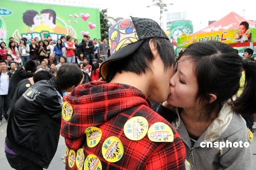2009年4月26日,四川省南充市街头某商家为了吸引眼球,组织了一场接吻大赛,情侣们站到广场中央相拥而吻,坚持10分钟者进入决赛。决赛时双方单脚立地,双手背后,接吻时间最长者获得冠军,冠军得主当场获得1000元奖金。中新社发 龙之文 摄