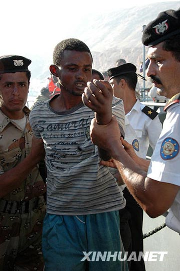 在也门港口穆卡拉,一名索马里海盗(中)被也门士兵押送下船。
