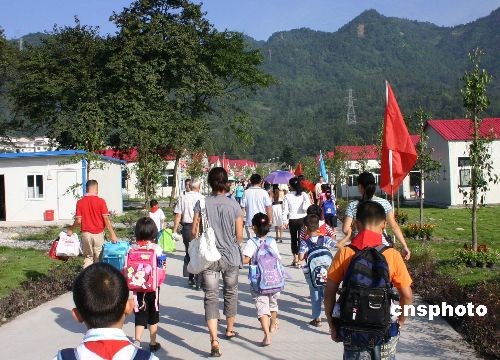 资料图片:2008年9月1日,四川省两万多所中小学新学期开学,五十一个地震重灾县的五千九百七十九所中小学校百分之百复课。开学第一天,在青翠的青城山下,都江堰最大的板房学校皖川中心校的孩子们走在美丽的校园中,低年级的孩子由家长陪同来上学。中新社发 黄永莉 摄