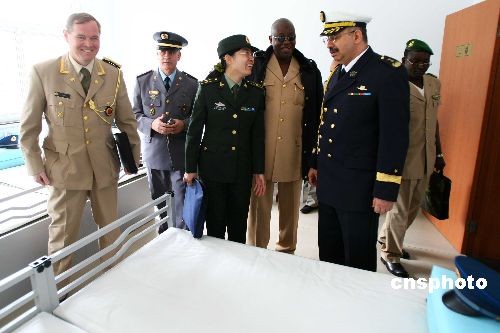 图为武官们在士兵宿舍参观。中新社发 富田 摄