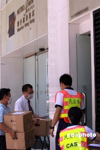 五月七日,香港湾仔维景酒店被隔离的限期进入第七天,继续有各界人士送来物资,给住客和员工。