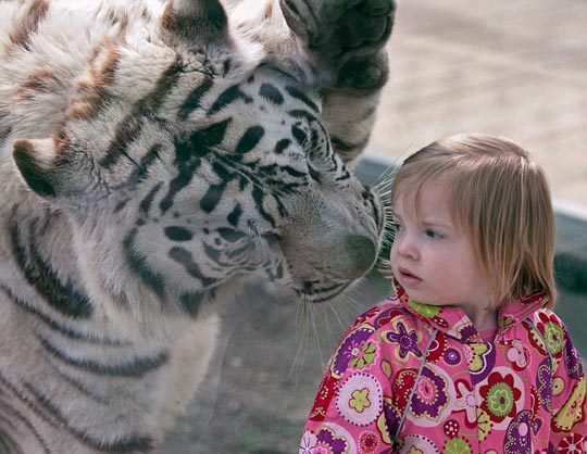 据英国媒体报道,美国一名业余摄影师日前在华盛顿的美洲狮山动物园拍摄孟加拉虎时,意外地拍下了一位2岁女孩与一只孟加拉大虎近在咫尺的“惊险”瞬间。