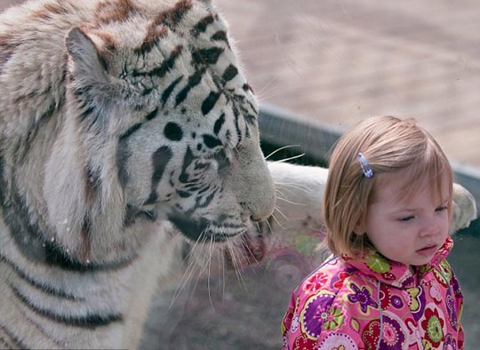 大老虎伸出爪子要去抓这位小女孩的肩膀。