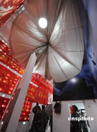 去年参加抗震救灾的成都军区某集团军“铁拳师”官兵,“5.12”一周年前夕专程到汶川大地震博物馆帮助布置一周年大展。图为首次灾区空降使用的降落伞。中新社发 贾国荣 摄