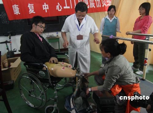 5月8日,医生在北川县北川中学康复站为“夹缝男孩”郑海洋检查的假肢。中新社发 郭国权 摄