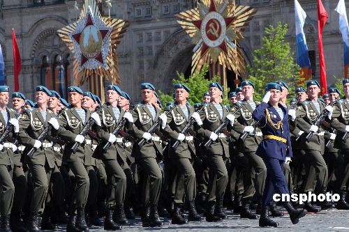 俄罗斯5月9日在首都莫斯科红场举行盛大阅兵式,庆祝卫国战争胜利六十四周年。图为受阅官兵方阵走过红场。中新社发 田冰 摄