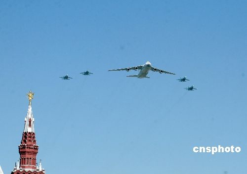 图为“安”-124“鲁斯兰”军用运输机在四架“苏”-27战斗机护航下飞过红场上空。中新社发 田冰 摄