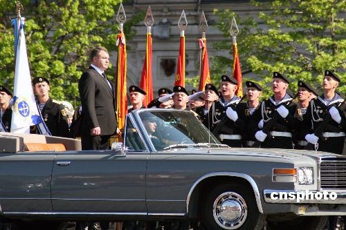 图为俄罗斯国防部长谢尔久科夫乘敞篷轿车绕场一周,向受阅部队官兵致以节日祝贺。中新社发 田冰 摄