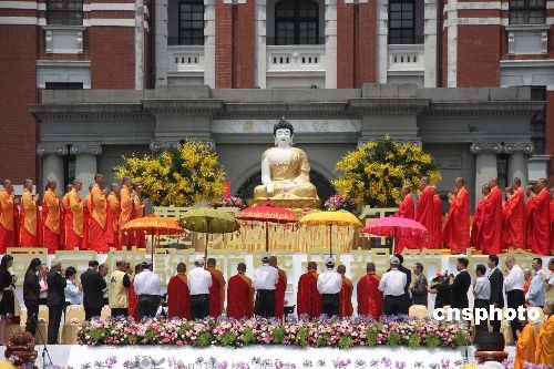 五月十日,台湾佛教团体以各种形式举办庆祝母亲节暨佛诞节活动。国际佛光会中华总会、佛光山寺及行政院环保署在台湾领导人办公室前的凯达格兰大道举办盛大的谢佛诞暨谢母恩法会,数万信众前来与会。中新社发 耿军 摄