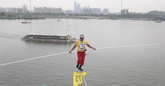 组图:韩国汉江上举行高空走钢丝竞速大赛(2)