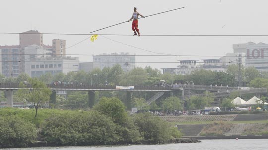 组图:韩国汉江上举行高空走钢丝竞速大赛(3)