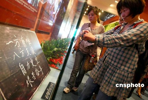 5月11日下午,“万众一心,众志成城——抗震救灾主题展览”在成都大邑县建川博物馆举行,展览开始前,所有参观者低头伫立为地震遇难者进行默哀。来自解放军、消防、警察、医疗,志愿者的数百名代表以及民众一起观看展览。主题展包括特大地震、坚强领导、全力营救、奋起自救、八方支援、重建家园、伟大精神等部分,通过大量照片、实物、表格以及多媒体画面,全面真实地再现了抗震救灾整体历程,据悉这是中国目前关于地震的规模最大的展览。图为参观者在专注拍摄展出的中国国家主席胡锦涛视察灾情时在一所小学黑板上用粉笔书写的“一方有难、八方支援,自力更生、艰苦奋斗”十六个大字。中新社发 富田 摄