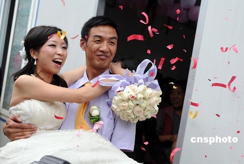 2009年5月12日,在5.12汶川大地震中救出29个人,被称为“中国最牛的志愿者”,“国家救援队的编外人员”的陈岩在四川德阳迎娶自己的新娘彭露。陈岩希望用这种方式让经历阵痛的人们忘记伤悲,感觉到爱的力量,重新开始幸福的生活。中新社发 张侃 摄