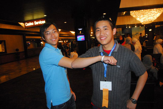 两名来自美国密西西比州的华裔学生见面用“撞肘问候”。