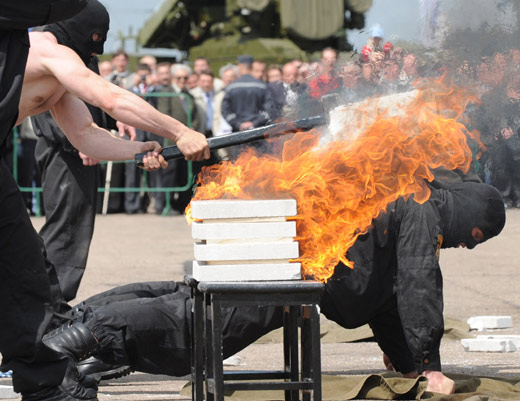 5月19日,第五届国际武器装备和军事技术展“米列克斯-2009”在白俄罗斯首都明斯克开幕,白俄罗斯特种部队队员表演火中碎石。为期四天的第五届国际武器装备和军事技术展吸引了来自约40个国家的军方代表团和企业参加。