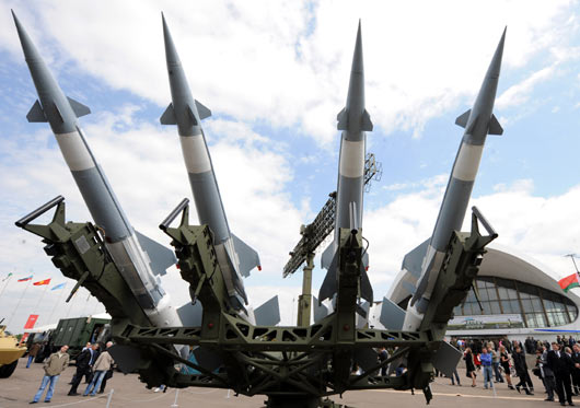 5月19日,在白俄罗斯首都明斯克举行的第五届国际武器装备和军事技术展“米列克斯-2009”开幕式上,观众参观展出的武器装备。
