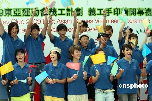 五月二十日,2009东亚运动会主题曲国际版 《You are the Legend》首播在香港九龙公园拱廊举行,歌星艺人官恩娜、陈伟霆、陈柏宇、周丽淇、裕美、EO2、高皓正、Soler等登场演唱,为活动拉开序幕。中新社发 洪少葵 摄
