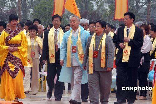 5月20日,来自美国、加拿大、香港、澳门、台湾等30多国家和地区的华侨华人代表,在湖北随州市共同拜谒了中华民族的始祖炎帝神农。图为毛泽东之女李讷(前右二)出席寻根节并敬献了花蓝。中新社发 张畅 摄