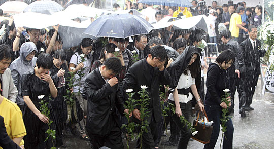 5月24日,韩国各地民众来到峰下村冒雨为辞世的前总统卢武铉举行哀悼仪式。