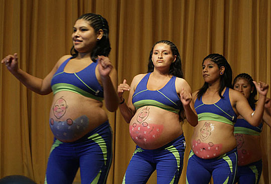 5月26日,在秘鲁首都利马,几名孕妇在腹部画上婴儿图案,参加“健康孕妇周”庆祝活动。