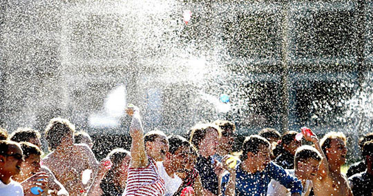 5月29日,在荷兰埃因霍温,学生们互相投掷充水的气球。埃因霍温理工大学的学生们当天互相扔了65000个充水的气球,希望以此打破世界记录。