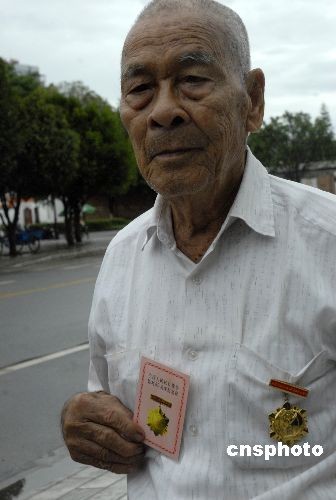 图为其中一名老兵展示自己获得的中国人民抗日战争胜利六十周年纪念章。中新社发 保旭 摄