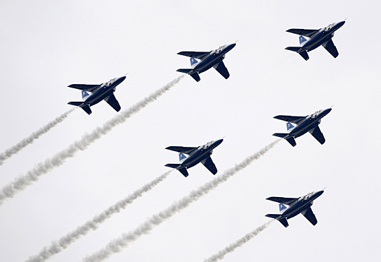 6月2日,在日本神奈川县首府横滨市,日本航空自卫队“蓝色冲击波”飞行表演队的T-4机群从日本神奈川县首府横滨市上空飞过。当日,日本航空自卫队举行飞行表演,庆祝横滨开港150周年。