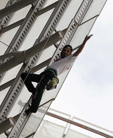 6月2日,在澳大利亚悉尼41层高的震旦城商务大厦,绰号“蜘蛛人”的法国男子阿兰·罗伯特在徒手攀爬后挥手致意。罗伯特因多次徒手攀爬世界各地的高层建筑而出名,曾征服过巴黎埃菲尔铁塔、悉尼歌剧院、纽约帝国大厦、吉隆坡国营石油公司双子塔楼等高层建筑,但也因其危险行动而招致非议。