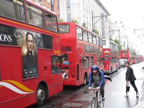 从当地时间6月9日晚开始举行的伦敦地铁48小时大罢工,使得许多市民不得不选择地面公交及自行车、步行出行。图为牛津街上公共汽车排成长龙的景象。中新社发 魏群 摄