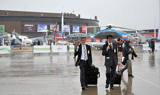 6月15日,在法国巴黎北郊的布尔歇国际展览中心,人们冒雨参观第48届巴黎国际航空航天展。第48届巴黎国际航空航天展当日正式拉开帷幕,并将持续到21日。作为世界上规模和影响力最大的航展之一,它已走过了整整100年的历程。