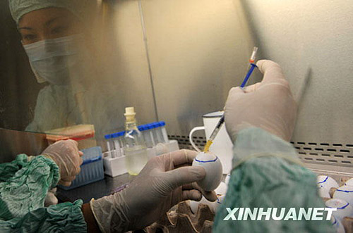 6月17日,研究人员在实验室里对鸡胚进行毒株接种。周超 摄