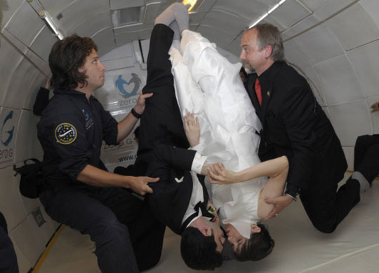 据英国媒体报道,21日,美国纽约一对热爱太空的情侣乘坐一架改装飞机,举行了人类首次“零重力婚礼”。飞机从佛罗里达州的肯尼迪航天中心起飞,首先爬升到1.1万米的高度,再做如同“过山车”般的俯冲,来到7300米的高度,从而让飞机内的乘客感受短短30秒的失重状态。两人就是在这一失重状态时,交换了婚戒。