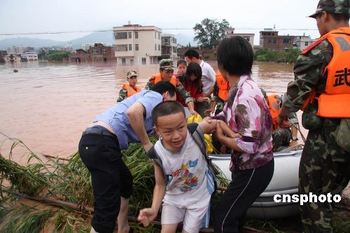 图为武警官兵成功解救出被洪水围困的一家五口人。