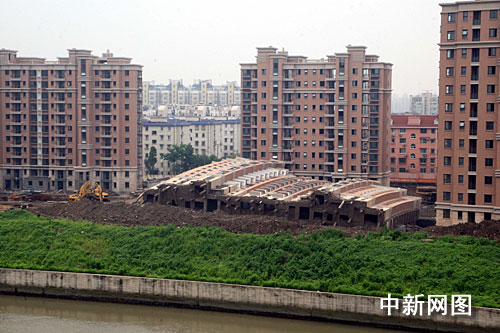 中新网上海6月27日电 今晨六时左右,上海闵行区莲花南路莲花河畔小区一幢在建13层楼房倒塌,造成一名工人死亡,无人受伤。事故原因目前正在调查之中。潘索菲摄