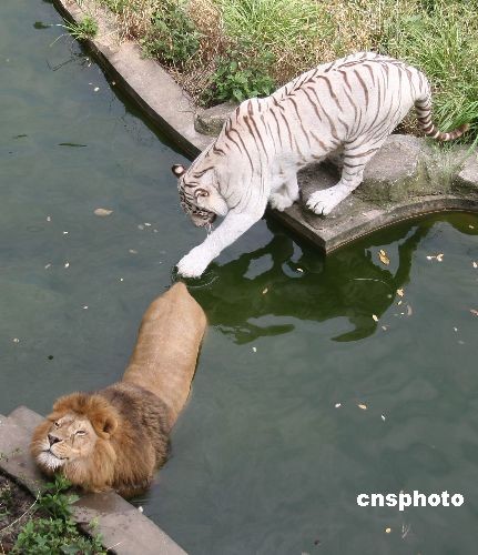 趣图:狮虎水中嬉戏躲避酷暑高温(3)