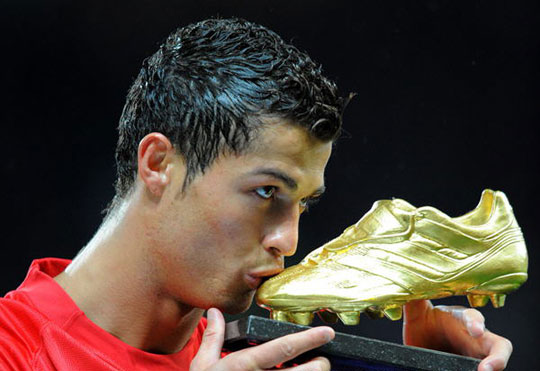 6月26日,西甲皇家马德里俱乐部宣布,已正式与葡萄牙球星C·罗纳尔多签约。合同为期6年,价值9300万欧元(约合1.29亿美元),C·罗纳尔多也因此成为目前职业球员中收入最高的。图为2008年10月29日C·罗纳尔多亲吻金靴奖杯。