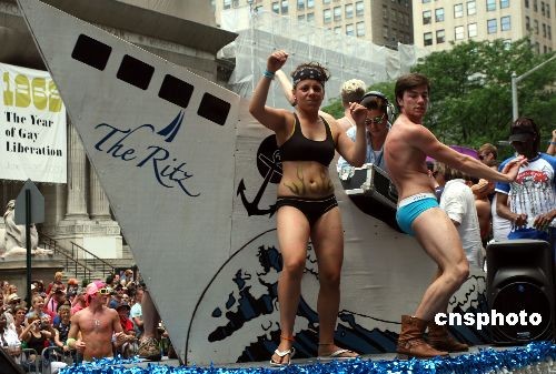 6月28日,一年一度的纽约同性恋游行在曼哈顿五大道举行。这一具有纽约特色的游行,也是全世界同性恋游行中最有年头的一个。今年的纽约的同性恋游行虽然受经济不景气的影响,但仍热闹非凡。 中新社发 彭伟祥 摄